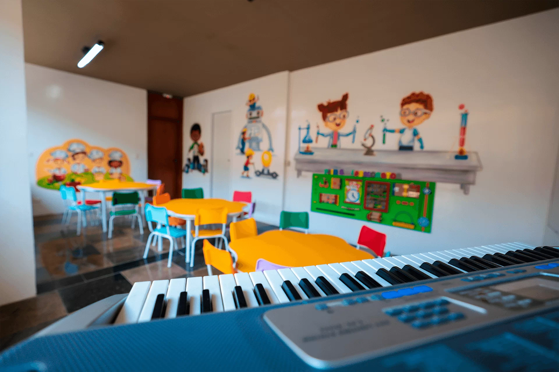 Nossa sala de criação proporciona um ambiente lúdico e adequado para a realização de jogos de construção, confecção de brinquedos e objetos, musicalização, culinária, ateliê. As propostas, diversificadas, dão lugar à criatividade e à liberdade, de modo a permitir que a criança descubra regras e técnicas. Além de exercitar a autonomia da criança, o processo de construir e criar desenvolve o raciocínio lógico e a imaginação; resultando no desenvolvimento da socialização e das habilidades individuais.